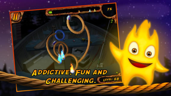 游戏的目的就是燃尽所有的绳子,并以燃烧掉绳子的百分比来进行评价,在画面上方的进度条中可以看到。要想得到最高的评价,就要下点功夫了。首先是点火,点火的位置要正确,这样可以引起多团火焰来帮助你燃烧绳子。其次点火的时机,在前面几个关卡你可能不需要这个步骤,但在往后的关卡,时机把握不好就会即刻让游戏失败。最后就是旋转绳子来控制火焰,尽量的保证火焰不灭。大家要记住,火焰是往上烧的,只要你保持这个模式,火焰就绝对不会熄灭,千万不可火焰在上,绳子在下,这样绝对会灭。